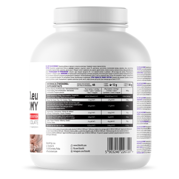 کنسانتره پروتئین وی استرویت OstroVit WPC80.EU ECONOMY با کیفیت ترین کنسانتره پروتئین وی است که حاوی 70 درصد پروتئین است. این مکمل یک منبع عالی از پروتئین حیوانی سالم است که طیف گسترده ای از اسیدهای آمینه را برای ساخت بافت های عضلانی ارائه می دهد. این محصول در فرآیند اولترافیلتراسیون ساخته می شود که در آن بخش پروتئین وی متمرکز بر جداسازی قبلی از شیر، شکر و چربی متمرکز می شود. با محتوای کم چربی و کربوهیدرات مشخص می شود.