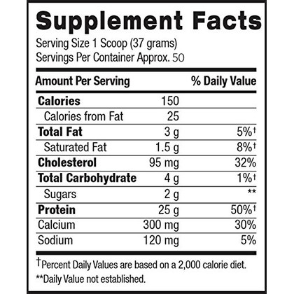 حاوی 150 کالری، 3.5 گرم چربی کل، 110 میلی گرم کلسترول ، 4 گرم کربوهیدرات، 25 گرم پروتئین، 250 میلی گرم کلسیم، 120 میلی گرم سدیم و 5 گرم بی سی ا ا در هر وعده